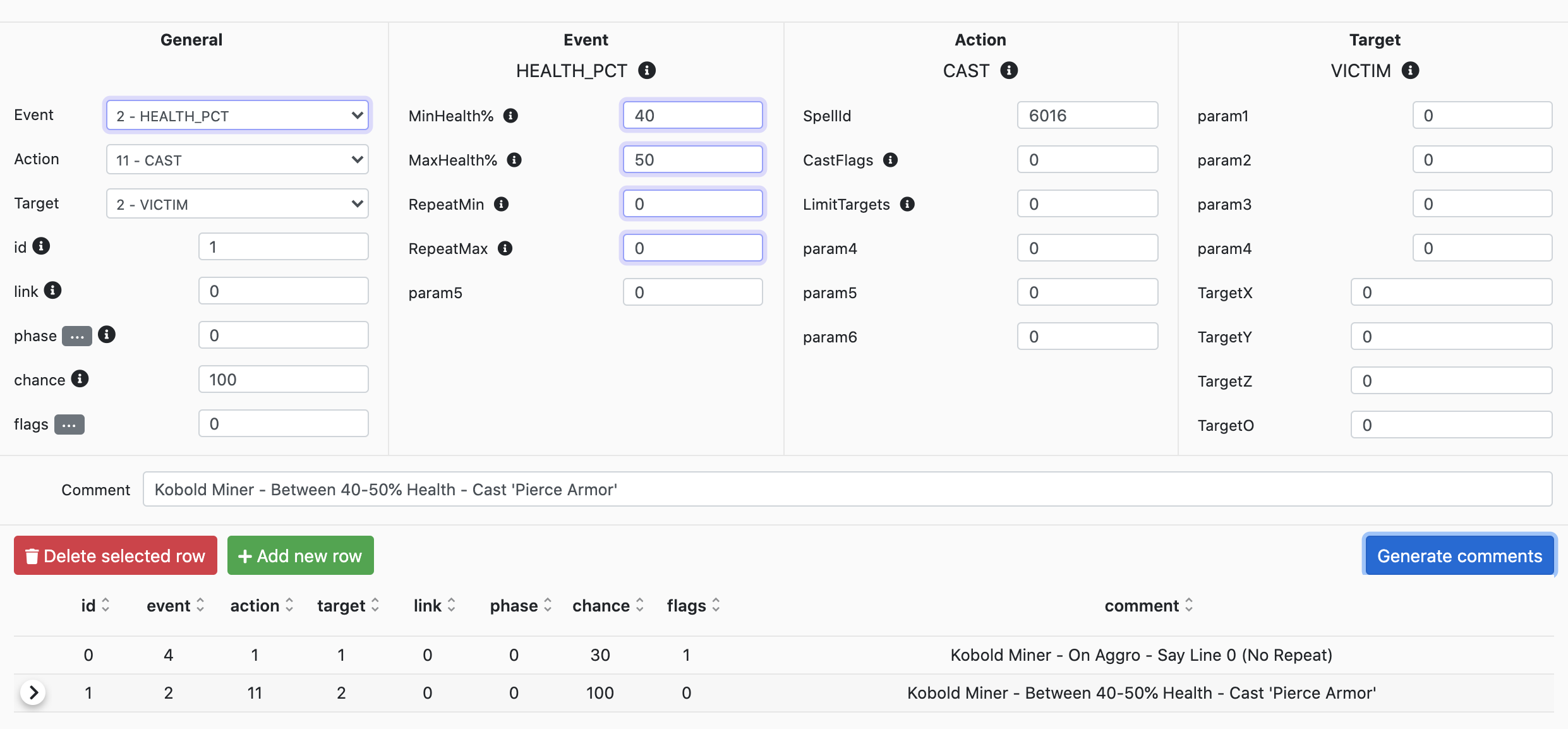 For example, you can make a creature cast a spell (action), when its health goes below 50% of its total health (event), against a random member of the party group (target).